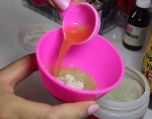 ➀大さじ一杯の商品を、リンゴ酢か水と同量でまぜます。混ぜるときのボウルやスプーンなどは金属製でないものを使ってください