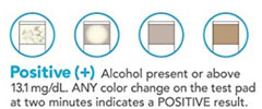 2分後の試験紙に以下のような変化があれば、母乳に13.1 mg/dLまたはそれ以下のアルコールが含まれていることを示しています。筋がはいったり、周囲が染まるだけでも、アルコールの存在を表しているようです。